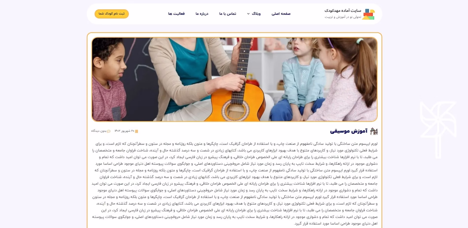 تمام تلاش متخصصین ما در این سایت این بوده که با بهره گیری طراحی رابط کاربری جذاب و کارآمد، به والدین و مربیان و صاحبان مهد کودک و آموزشگاه کمک کند تا به راحتی و با سرعت بیشتری به اطلاعات مورد نیاز خود دسترسی پیدا کنند. همچنین، با ارائه بخش مقالات آموزشی جذابیت و کارایی سایت شما در این زمینه بیشتر خواهد شد. در این سایت علاوه بر زیبایی و جذابیت سعی شده تا امکانات خوبی نیز برای شما فراهم شود و این امر محقق شده است.