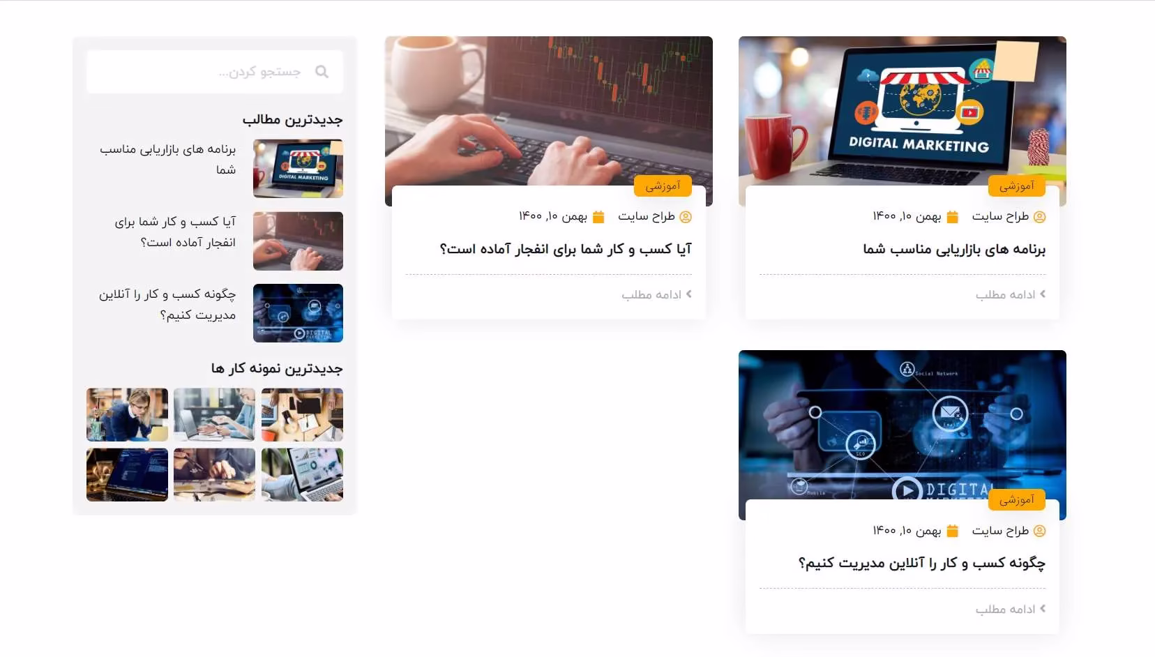 وب سایت آماده دیجیتال مارکتینگ ، شروع قدرتمند در دنیای آنلاین که میتوانید با استفاده از این قالب آماده خدمات خود را به شکل خیلی حرفه ای ارائه کنید و شرکت خود را به بهترین شکل ممکن در این حوزه معرفی کرده و یک برند قدرتمند برای خود بسازید .